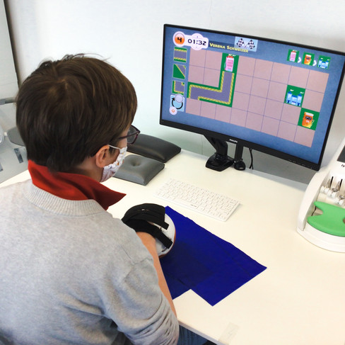 Mit Katharinas liebsten Therapiegerät „Myro“ - ein interaktives Therapiesystem mit einer sensorbasierten Oberfläche - wurde ein alltagsnahes, motorisches Lernen von groß- und feinmotorischen Fähigkeiten und Bewegungen von Armen bzw. Händen ermöglicht. Durch den Einsatz verschiedener Objekte wie z.B. einem Stift, einer Tasse oder einem Ball konnten unterschiedliche Griffarten wie z.B. der Lateralgriff (Fixieren eines Gegenstandes zwischen Daumen und Seitenkante des Zeigefingers) funktionell verbessert werden.